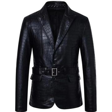 Classic Black Crocodile Belted Blazer – Luxury Lapel Collar Coat